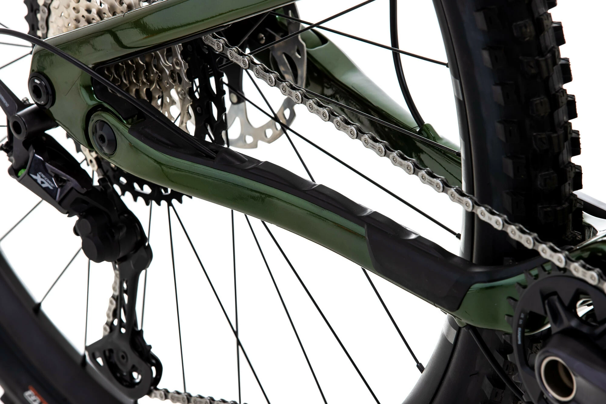Robust frame protection on downtube, seat stay and chain stay. Chain stay protection features a soft rubber to quieten chain slap.